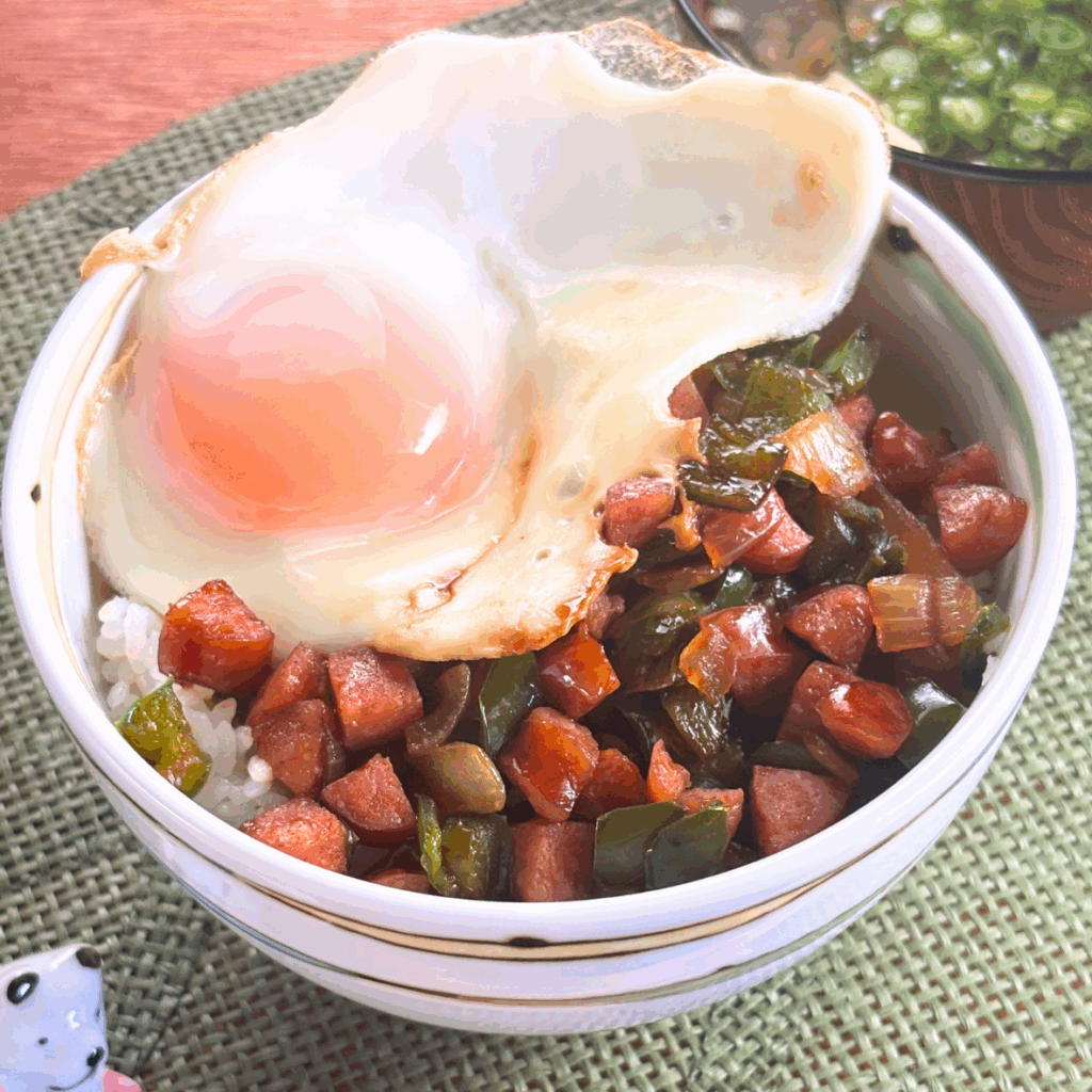 ⑥器にご飯を入れ、上に炒めたものを半分いれ、目玉焼きをその横に載せたら完成!