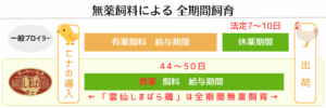 (※アニマルウェルフェア(=家畜の快適性に配慮した飼育管理)に対応し、鶏病が発生した場合、獣医師の指導によりやむを得ず法律に基づいた投薬をする場合があります。)